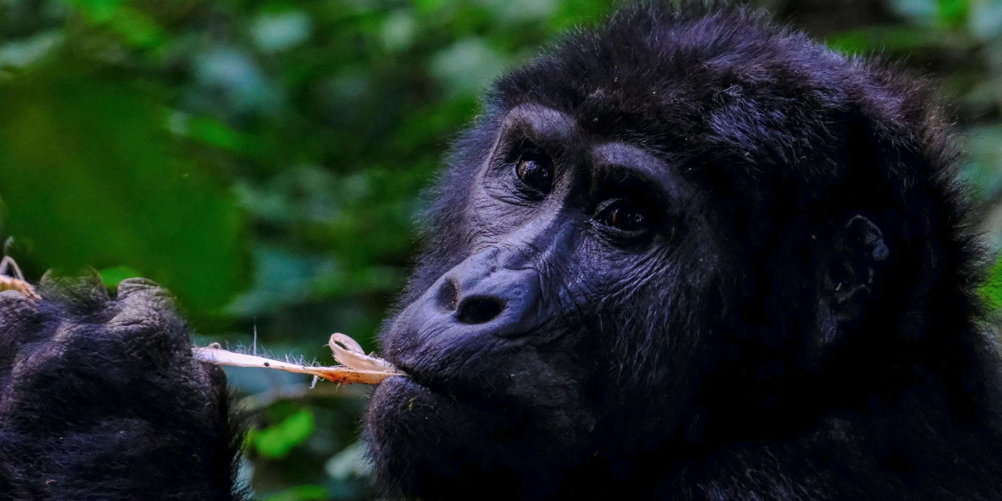 Bwindi Impenetrable National Park covers an area of 190 square miles and is located in southwestern Uganda on the edge of the Western Rift Valley. Designated as a World Heritage Site, Bwindi is a world of towering trees, giant ferns, tangled undergrowth and hanging vines, creating the quintessential equatorial jungle. The altitudinal range of montane and lowland forests at Bwindi support more species of trees, ferns, birds and butterflies than any other forest in East Africa. It is also the only one which contains both gorillas and chimpanzees. Bwindi is home to about 300 endangered mountain gorillas (50% of the world population) and is therefore of critical importance to their continued survival. From this mountain gorilla population, two families are habituated for visitors to trek.